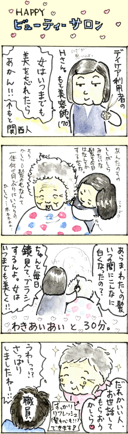 我故郷「安芸津町」での楽しい出来事や、地域での伝統行事の様子、南海診療所・デイケアでの心温まる出来事を、ユーモアたっぷりの4コマ漫画にしています。作者はスタッフの似顔絵を描いてくださった山根さんです。