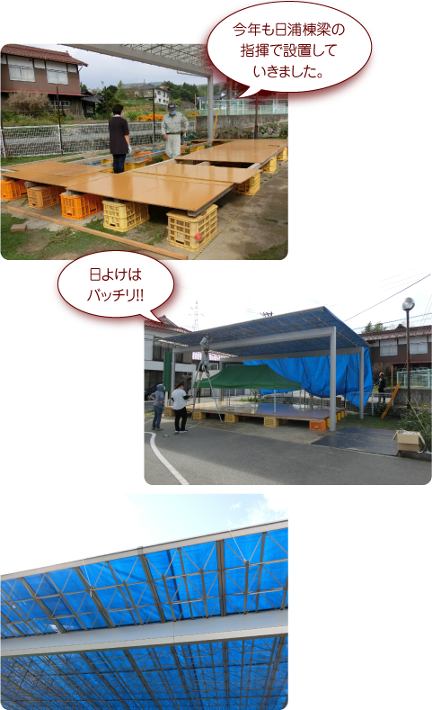 外では、舞台と日よけの準備です。